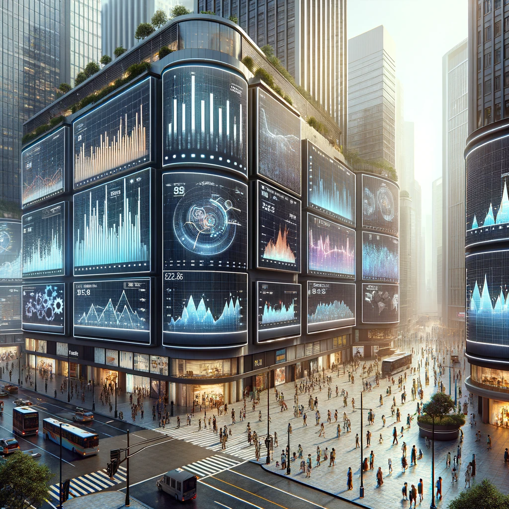 This illustration shows a cityscape with skyscrapers, each featuring digital billboards displaying time-series graphs. These graphs represent various types of data such as stock market trends, weather patterns, and population growth, set against the backdrop of a bustling city with people of diverse descents and genders. This setting should provide a compelling and relatable context for your introduction to time-series lecture.