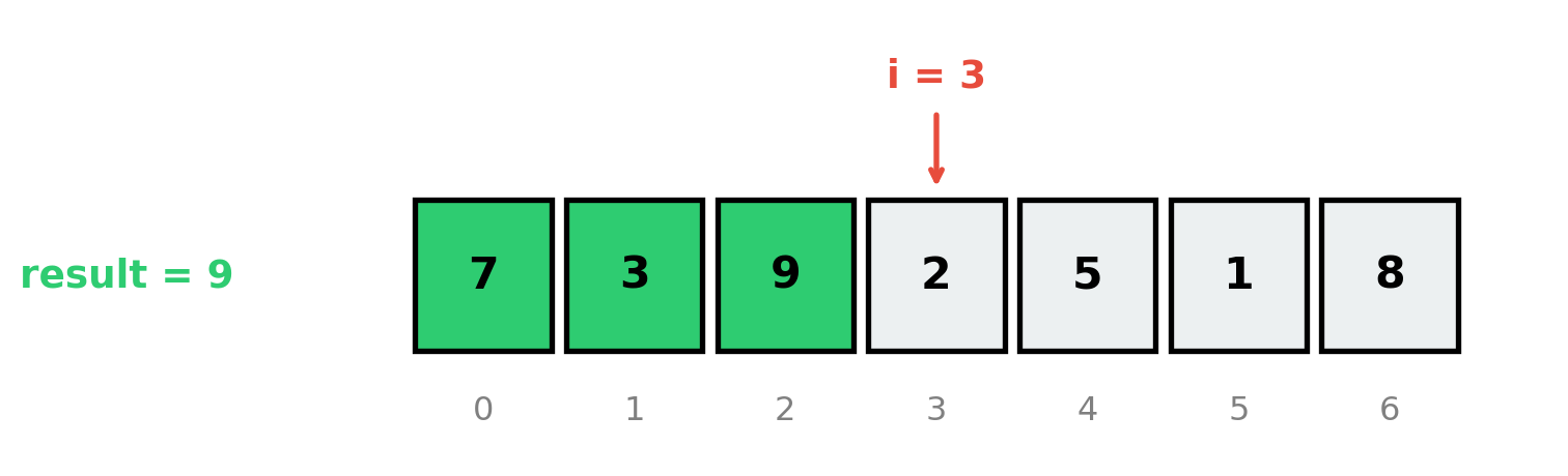 i = 3 (about to examine index 3)result = 9 = maximum of arr[0:3] = maximum of [7, 3, 9]The Invariant: At iteration \(i\), result holds the maximum of arr[0:i].