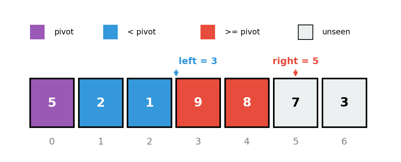 right = 5 (about to examine index 5, which has value 7)arr[1:left] = arr[1:3] = [2, 1] — all < pivot (5)arr[left:right] = arr[3:5] = [9, 8] — all >= pivot (5)The Invariant (at iteration right):